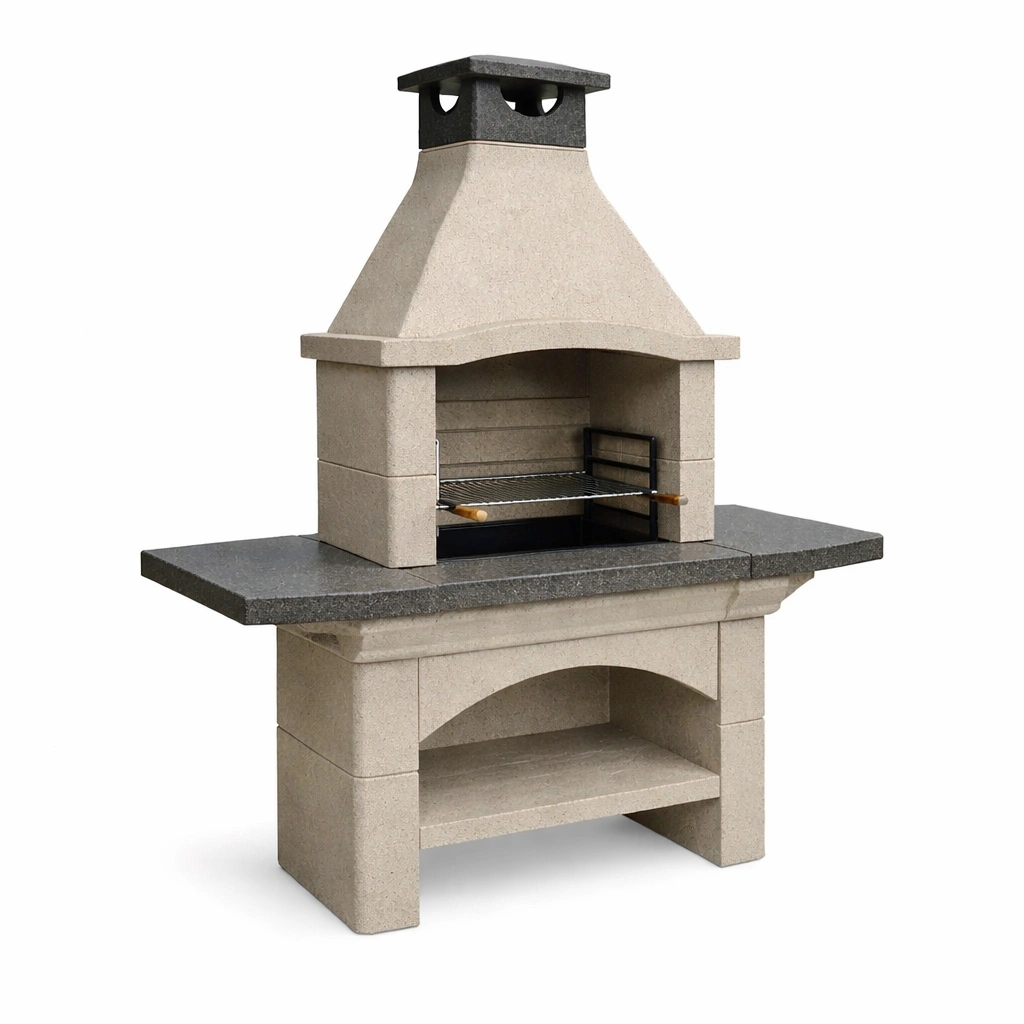 Ein Gartengrillkamin aus robustem poliertem Beton. Die Hauptfarbe ist Naturgrau mit Anthrazit Akzenten. Geeignet für die Nutzung mit Holzkohle als Energiequelle.